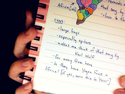 um...what provoked this list...um... i don't know. i also wrote one about the pros and cons of getting your teeth pulled. but truthfully, i've never really had my teeth pulled or been to africa. maybe it's just an inherent need to voice my opinion on subjects i have no real authority on? also, is this marcie rempel?